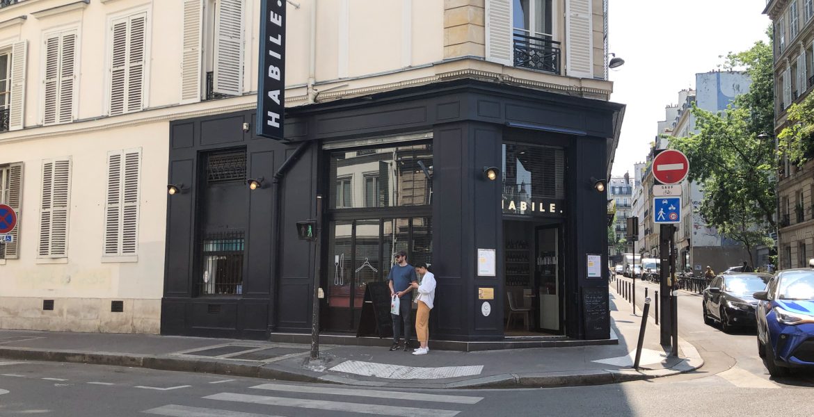 レピュブリック広場からすぐ、濃紺のファサードが目印の「HABILE.」は、シェフのエリックが腕を振るうレストランと、デザイナーのカミーユが手がける洋服のショップが1つになった、ちょっと面白いコンセプトのお店。