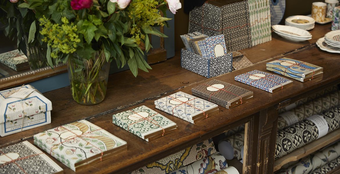 バスティーユ界隈の静かな中庭にたたずむ「アントワネット・ポワソン」のアトリエ・ブティックは今年リニューアルしてより美しく広々とした空間に生まれ変わりました。印刷されて乾かす途中のドミノペーパーやさまざまな道具が並ぶアトリエはブティックの隣にあり、運が良ければ実際に印刷や色付けをしている様子を見ることもできます。