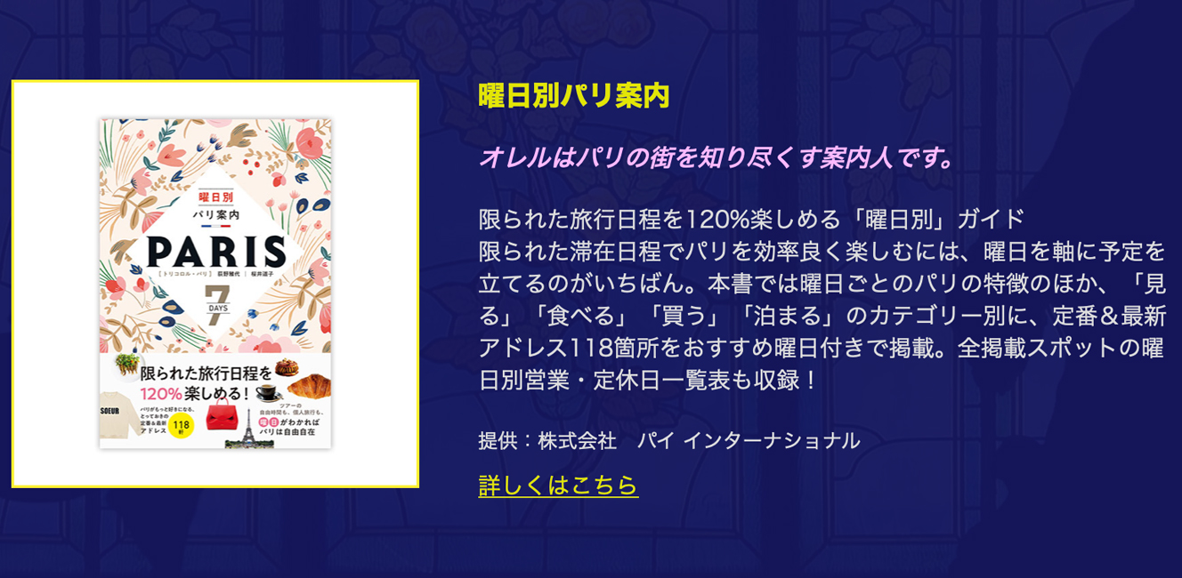 公開を記念して、8月10日〜31日までツイッターでのキャンペーンが実施されています。トリコロル・パリのガイドブック『曜日別パリ案内』もパリから届いた宝物のひとつとして当たりますので、ぜひふるってご参加ください!