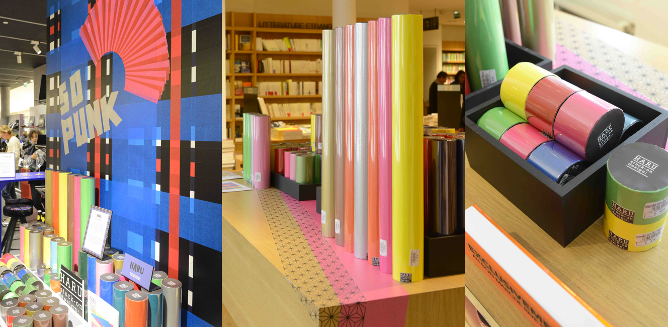 ボン・マルシェの1階メイン催事場での展示のほか、2階の書籍売場で「HARU stuck-on design;」のテープも販売されています。フランス在住の方たちは、ぜひこの機会にチェックしてみてください。また、9月7・8日の週末の11時〜19時にはパリのグラフィックデザイナー、ミッシェル・バレト氏による「HARU stuck-on design;」を使用したインスタレーションライブが行われます。
