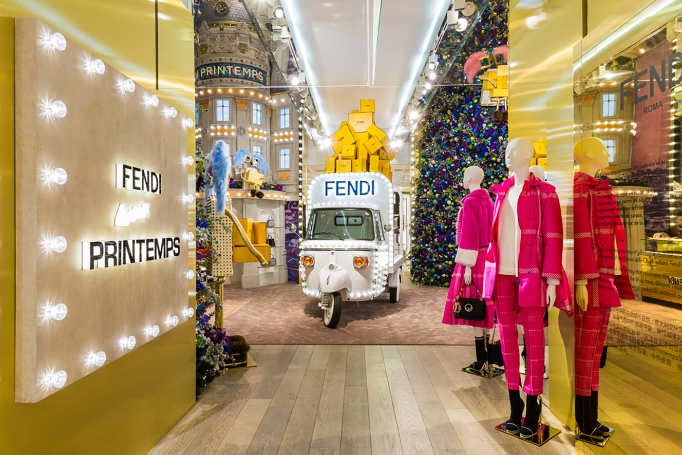 モード館中央のアトリウムではフェンディのポップアップショップ「Fendi loves Printemps」もオープン。フェンディのキャラクターであるワンダーズたちが11mのツリーの横で踊っています。