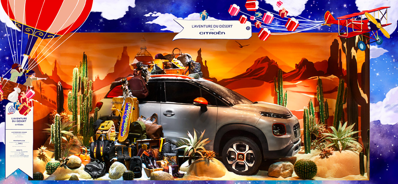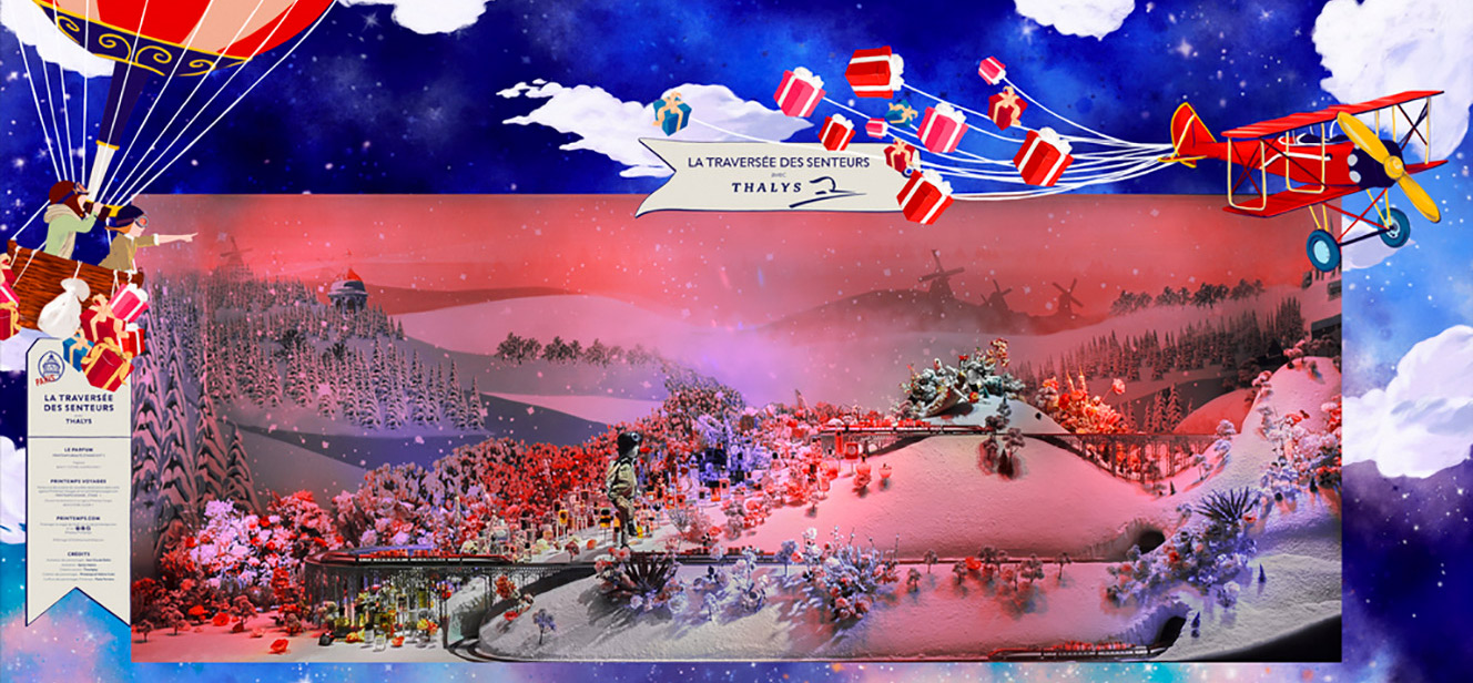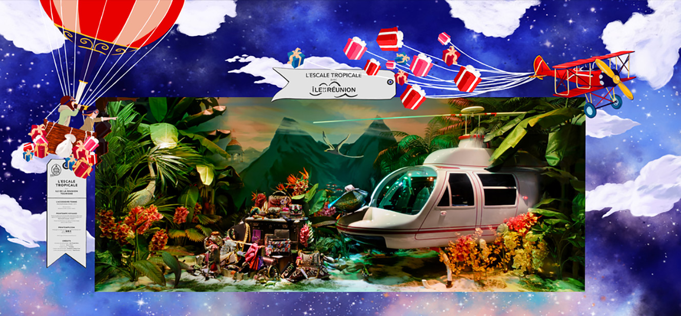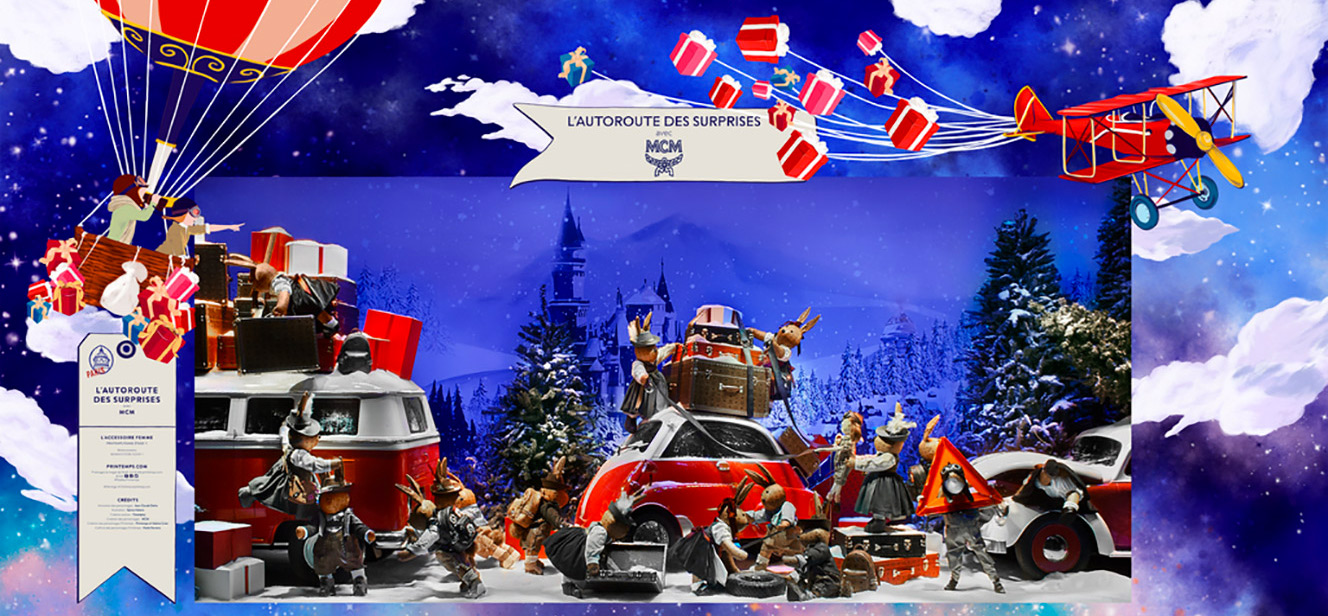 今年のプランタンのクリスマスのテーマは、「プレゼントたちの不思議な旅」。ジュールとヴィオレットという2人の子供が世界中にクリスマスのプレゼントを探しに旅に出るというストーリー。旅先でたくさんの仲間たちの協力を得て、クリスマス前夜にプランタンへ戻ってくるまでの物語が11のショーウィンドウの中で繰り広げられます。