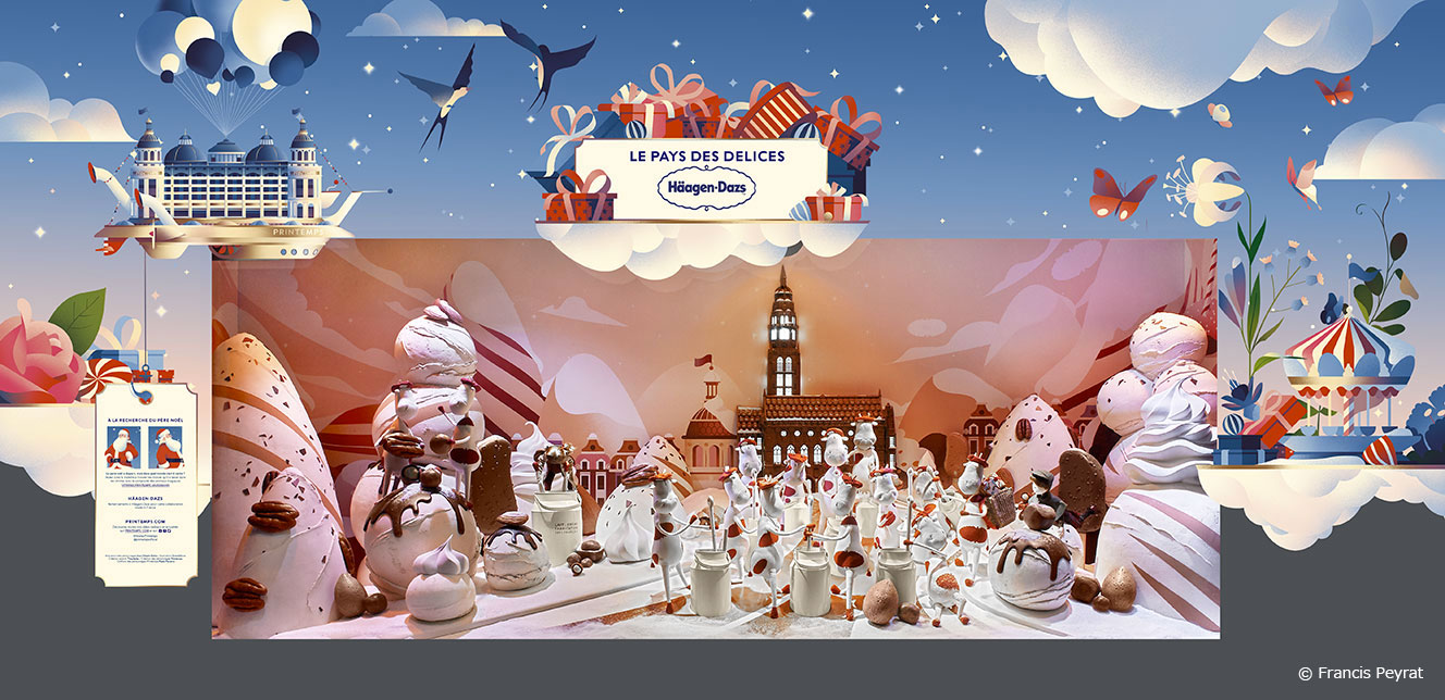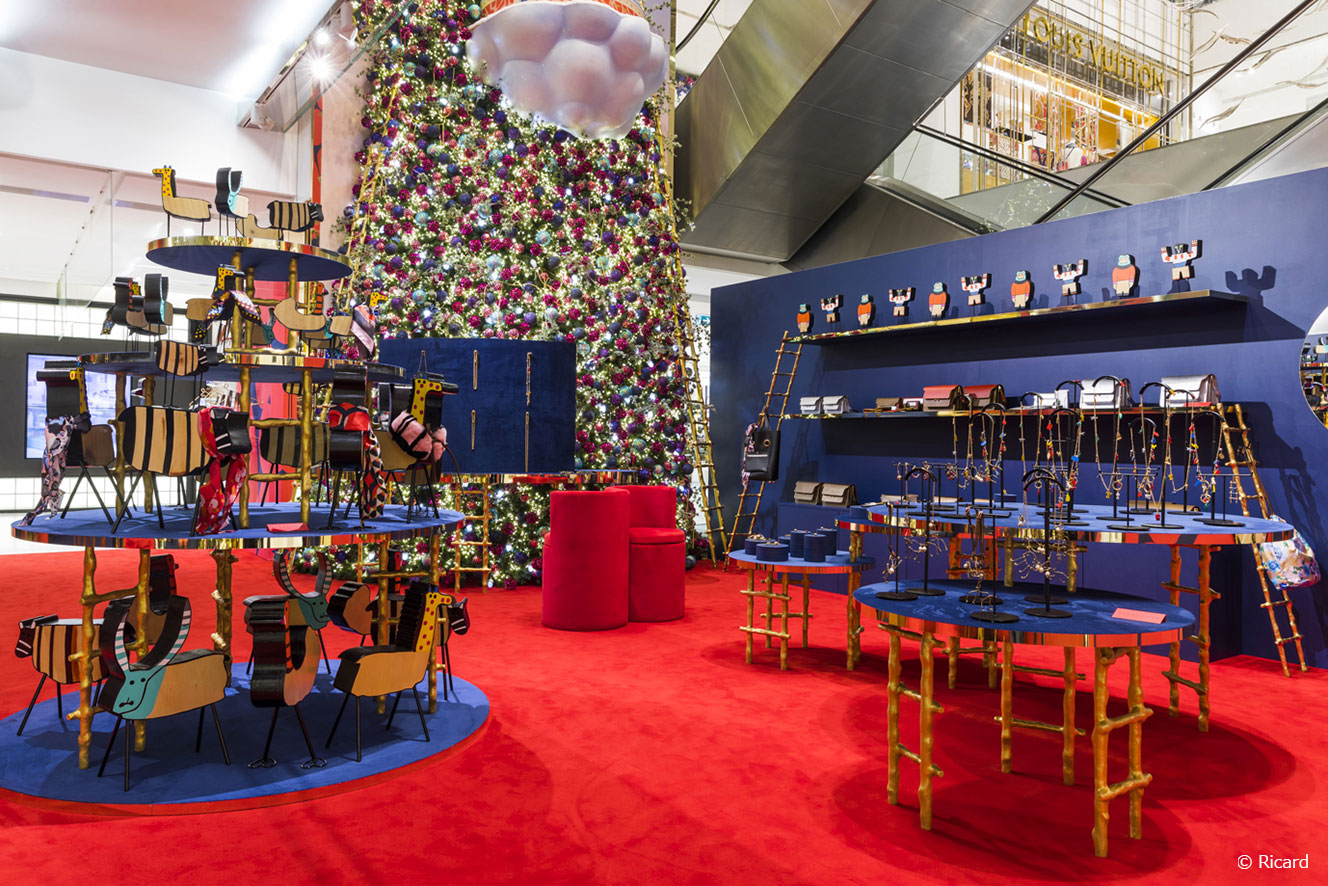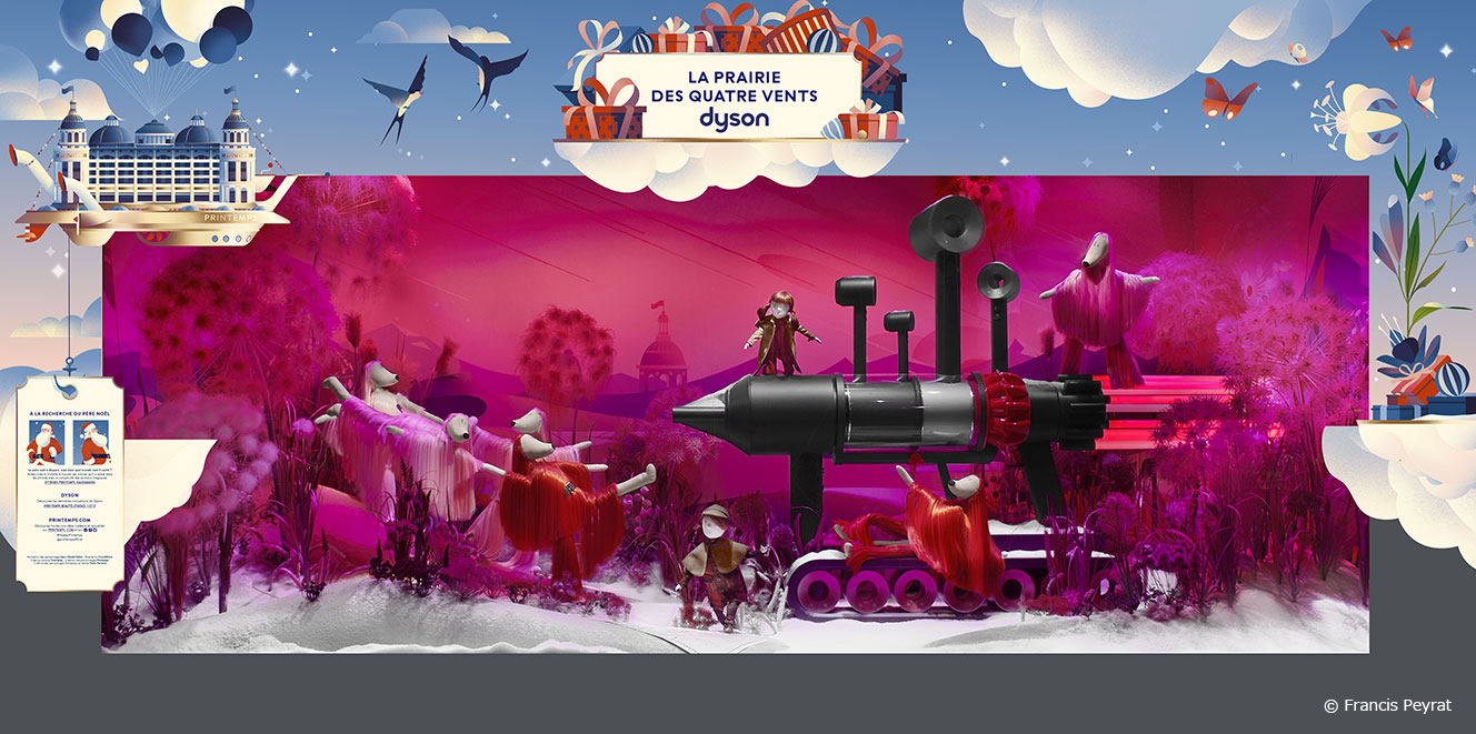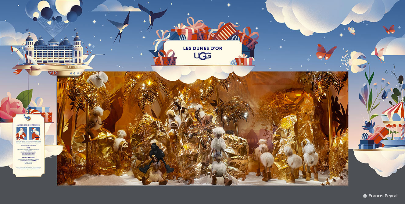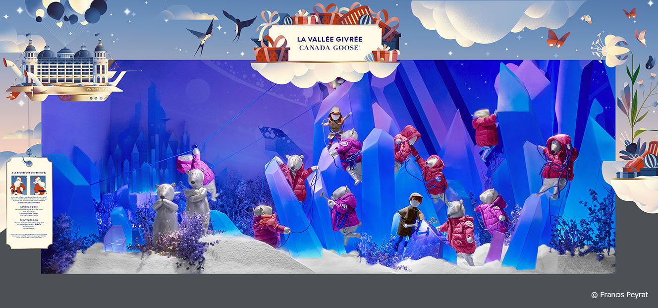 今年のプランタンのクリスマスのテーマは「サンタクロースの魔法の世界」。ショーウィンドウでは、プランタンのマスコットであるジュールとヴィオレットの二人の子供がサンタクロースを探して、魔法の世界を旅します。