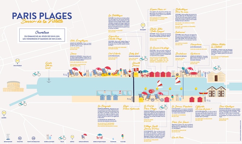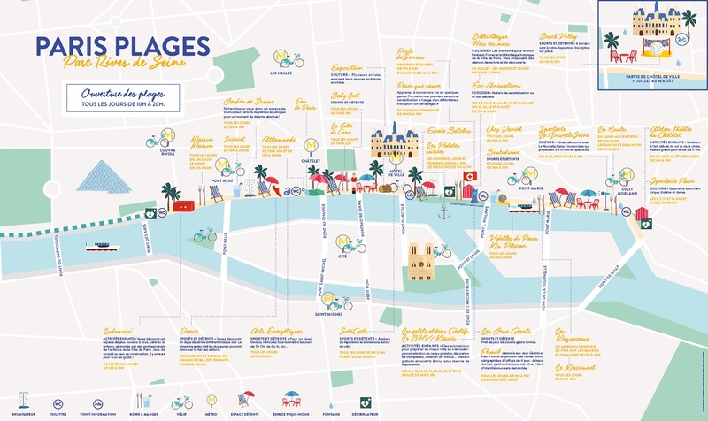 パリ・プラージュの会場は、ルーヴル美術館にほど近い芸術橋(Pont des Arts)のあたりからサン・ルイ島にかかるシュリー橋(Pont de Sully)までと、パリ市庁舎前広場、ラ・ヴィレット(メトロJaurès駅近くの運河沿い)です。様々なコンサートやスポーツ、ダンスレッスン、子供向けゲーム、移動本屋、レストランなど、毎日楽しいイベントが開催される予定です。