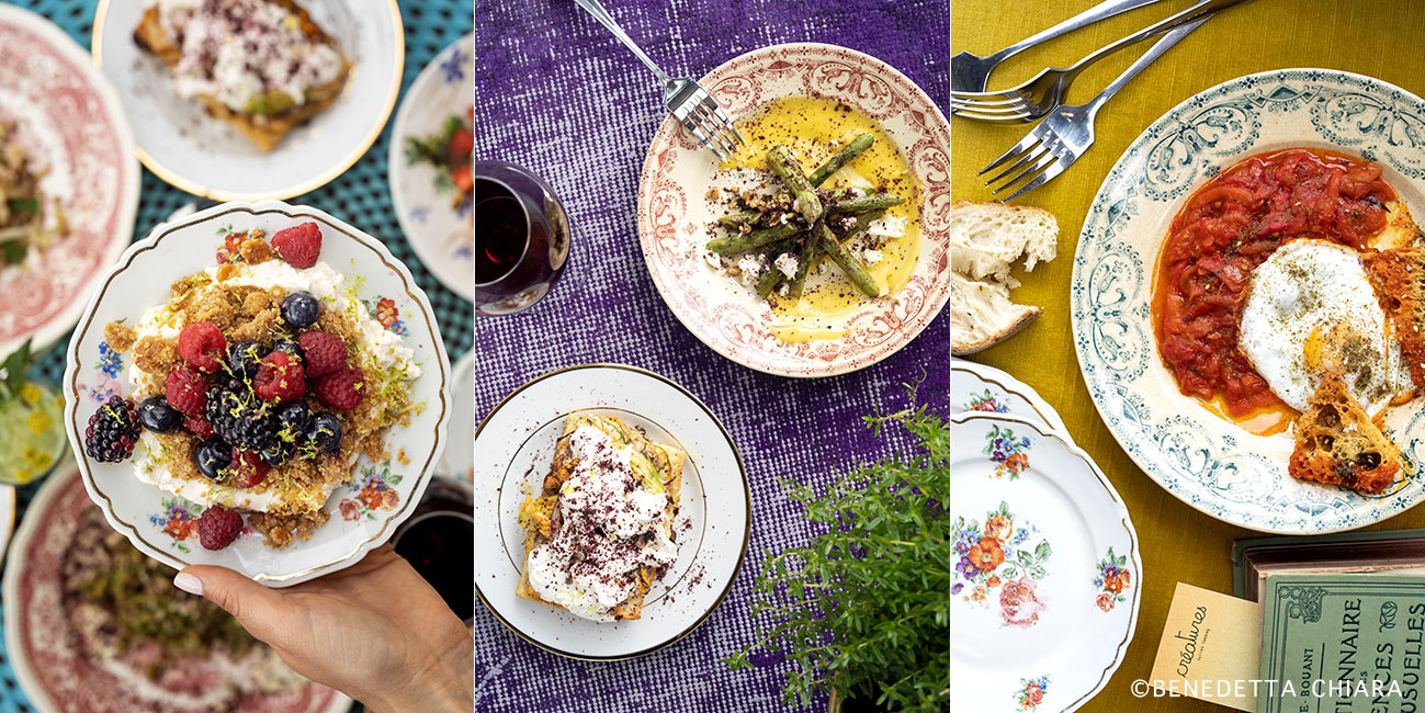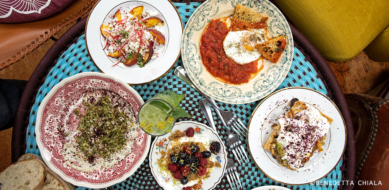 アボカドとグレープフルーツのオープンサンドイッチや、パプリカと卵、フムスのプレート、ケイパー風味のソースで食べるじゃがいものグリルなど、色とりどりで夏らしい地中海風のメニューは、タパスやメッツェのようにみんなでシェアして楽しみたいサイズで、100%ベジタリアン。