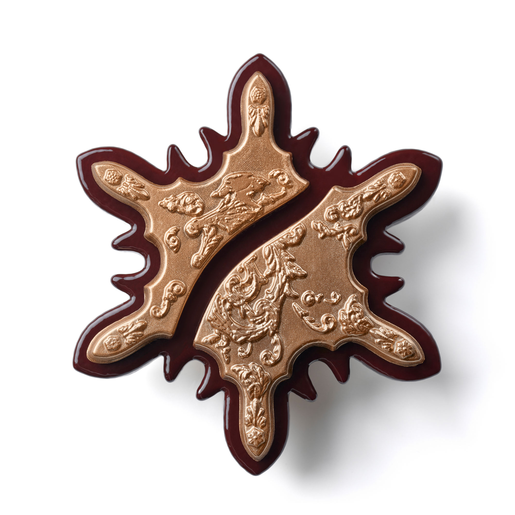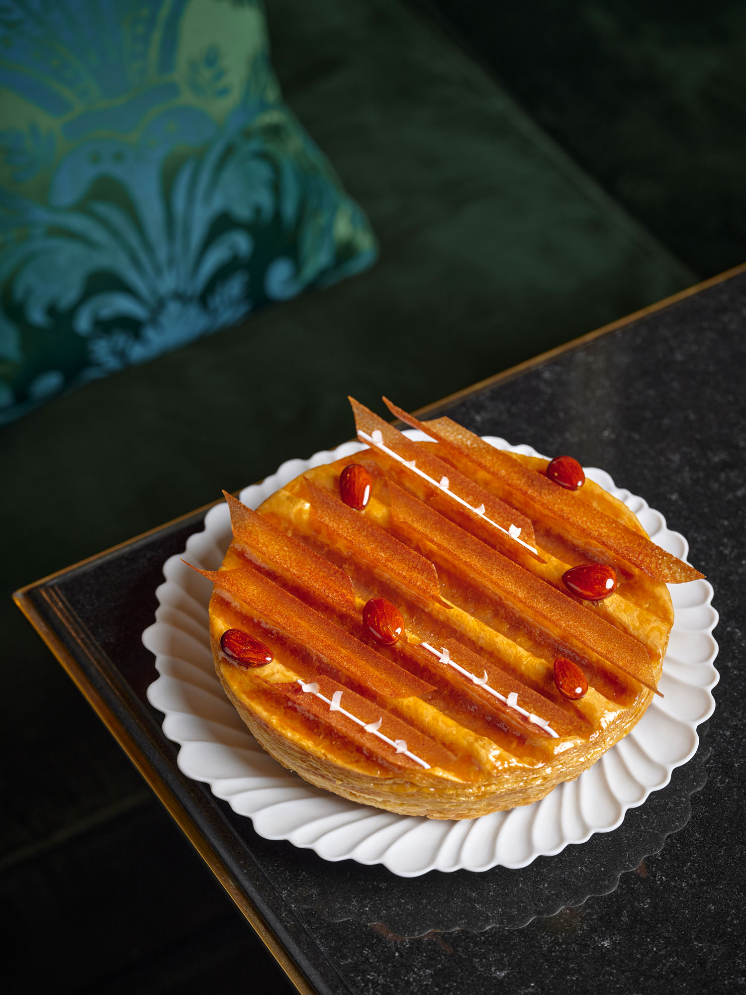 そして、新年を迎え、1月6日のエピファニーをお祝いするのに欠かせないフランス伝統のお菓子ガレット・デ・ロワ。オレンジフラワーとメキシコ産バニラで香りをつけたフランジパン(アーモンドクリーム)がサクサクのパイで包みこまれています。ガヴォット(極薄のミニクレープ)とバレンシア産アーモンドのキャラメリゼで彩られたデザインも素敵。1個65ユーロ(6〜8人前)。販売期間は2025年1月5日〜12日。ホテル内レストラン「La Pagode de Cos」でもデザートとして味わえるそうです。