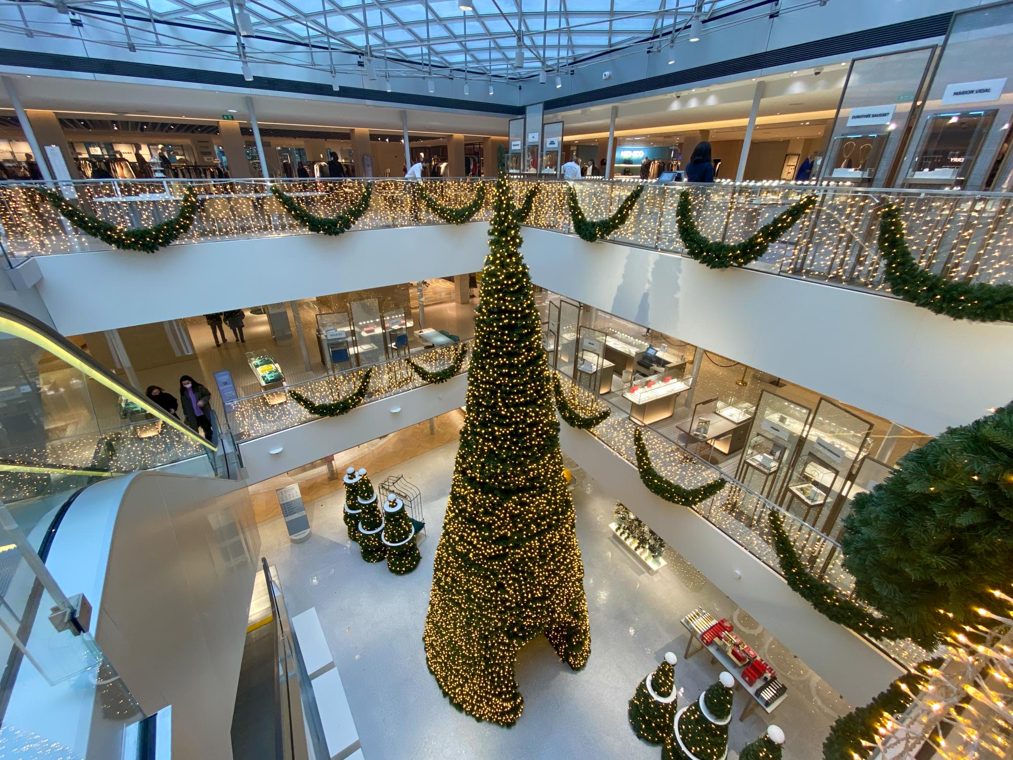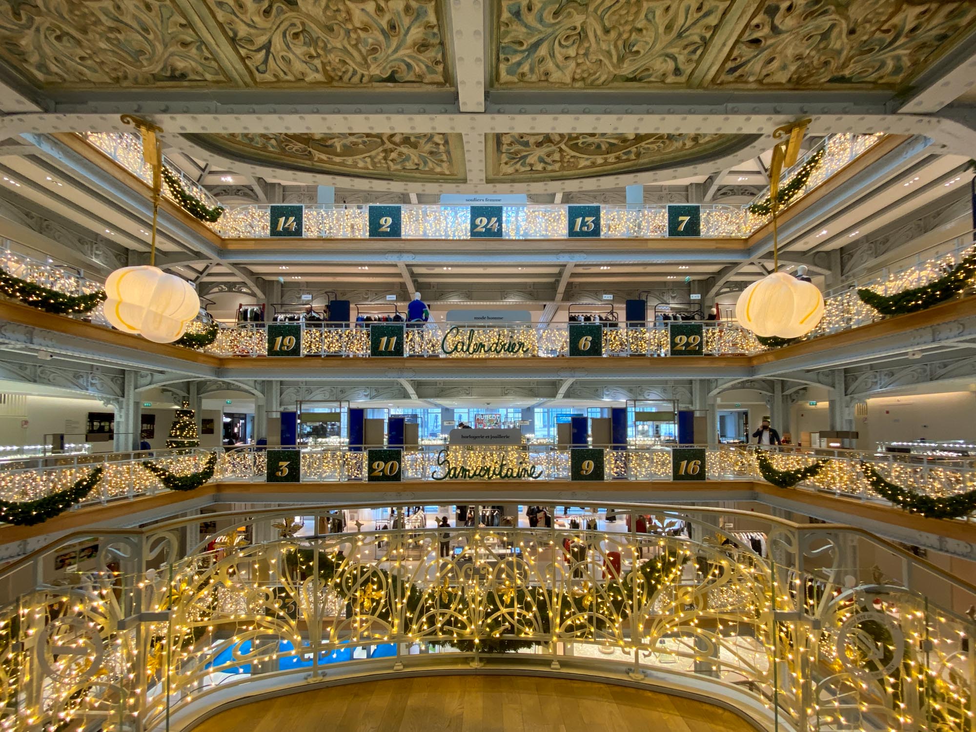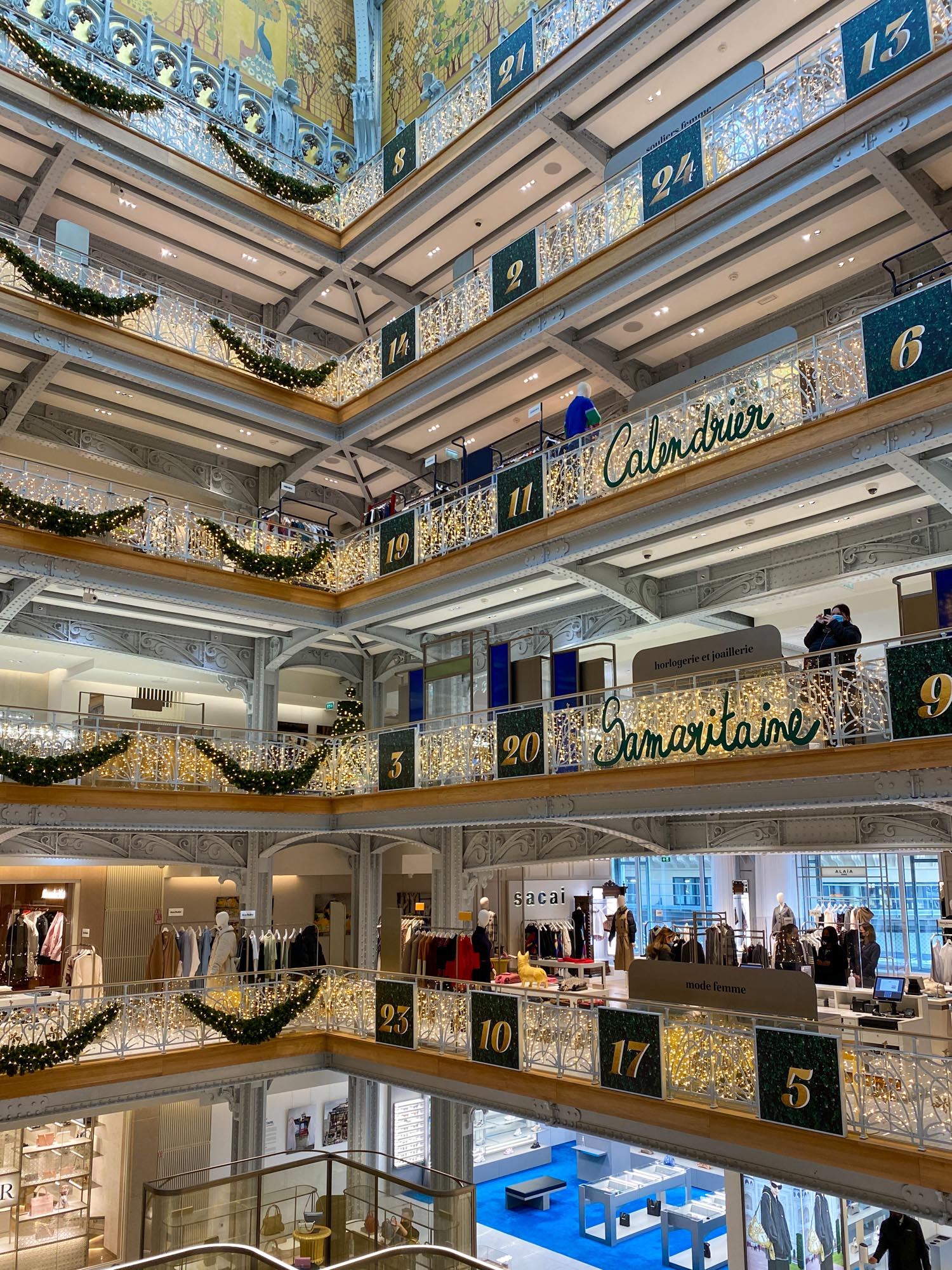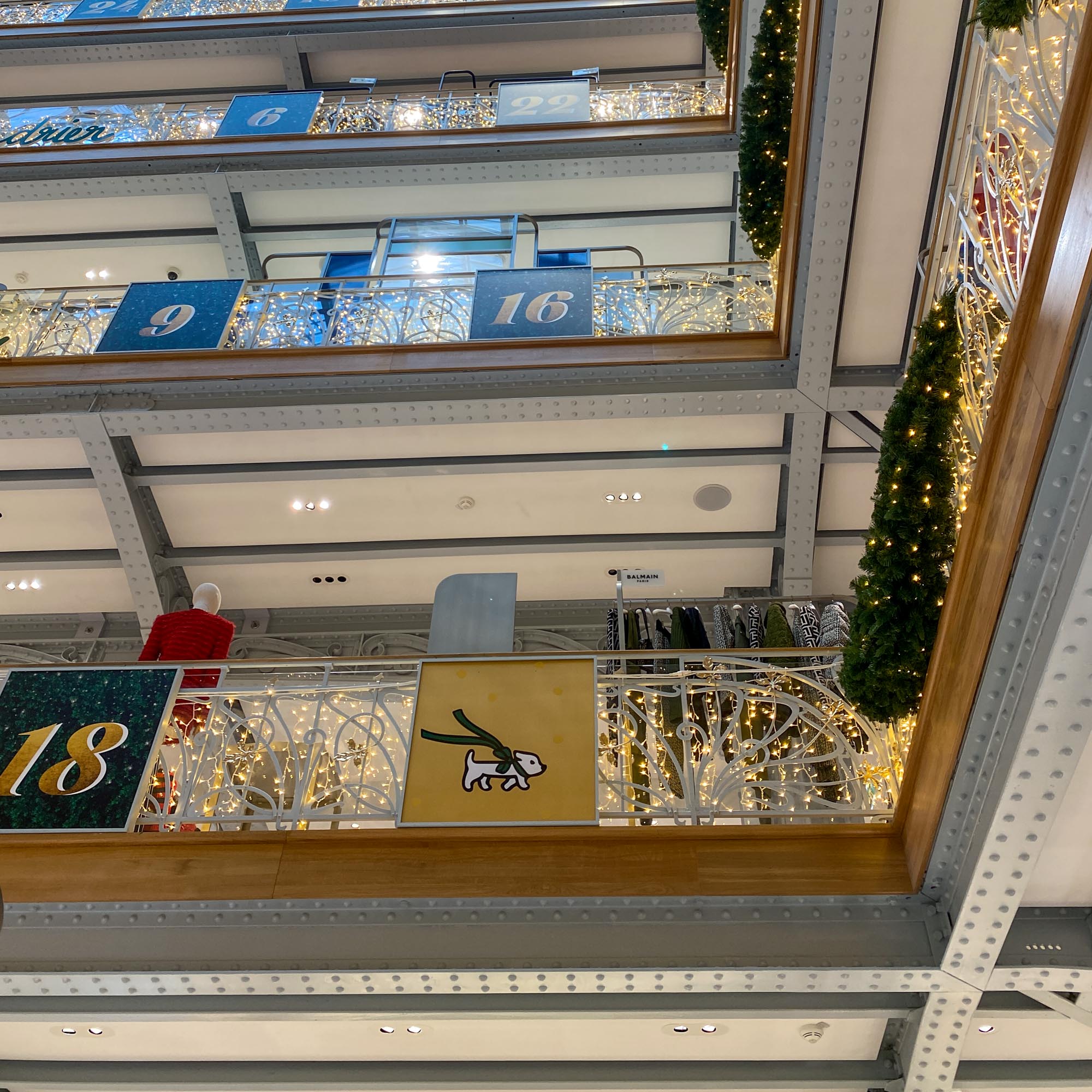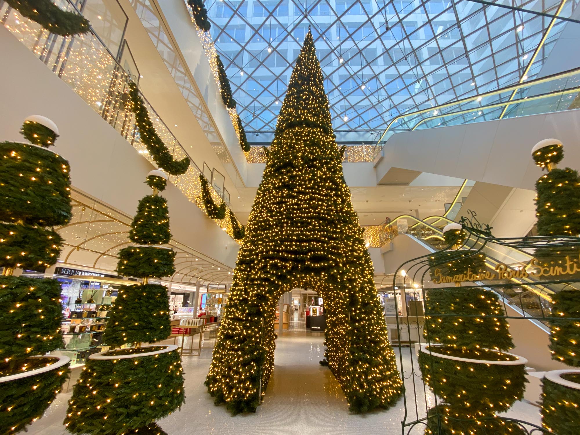 2021年サマリテーヌのクリスマス 2021年6月、16年ぶりに復活した老舗デパート「サマリテーヌ」でもリニューアル後初めてのクリスマスシーズンが開幕しました! ツリーのグリーンと、ゴールドに輝く飾りでまとめたシンプルシックなクリスマス!注目はポン・ヌフ館のアールデコ様式の美しい吹き抜けに12月1日から登場したアドベント・カレンダー。 12月1日はこんな可愛いワンちゃん登場。