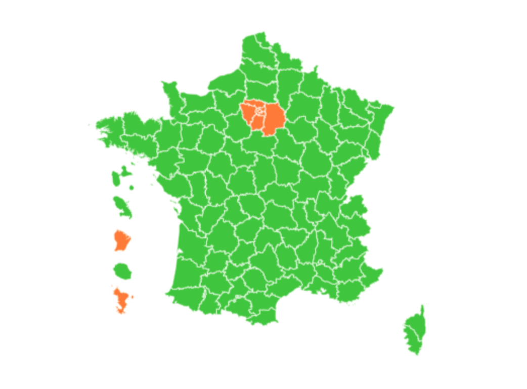 • 感染状況は地方によって大きな違いがあり、東の方が西の方より悪い。特に悪化しているのはGrand Est(首府ストラスブール)、Bourgogne-Franche-Comté(首府ディジョン)、Auvergne-Rhône-Alpes(首府リヨン)、Provence-Alpes-Côte d’Azur(首府マルセイユ)の4つの地域圏。
