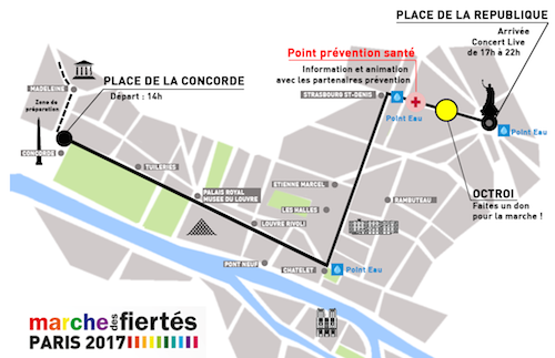 パレードは14時にコンコルド広場をスタート。リヴォリ通りをチュイルリー公園〜ルーヴル美術館〜シャトレ広場と進んだあと、北上して最後はレピュブリック広場が終点です。レピュブリック広場では17時〜22時までコンサートが行われます。