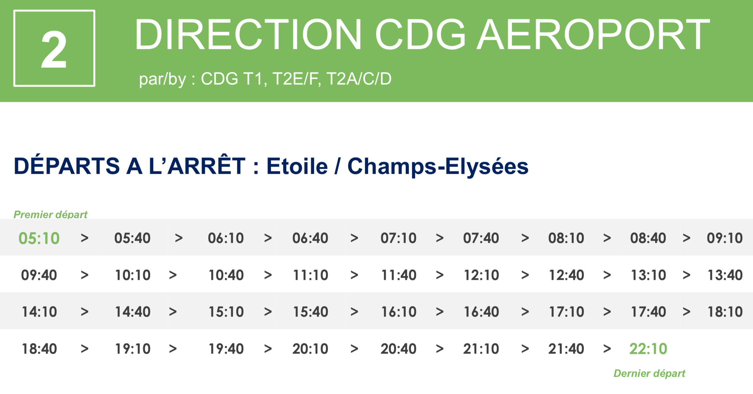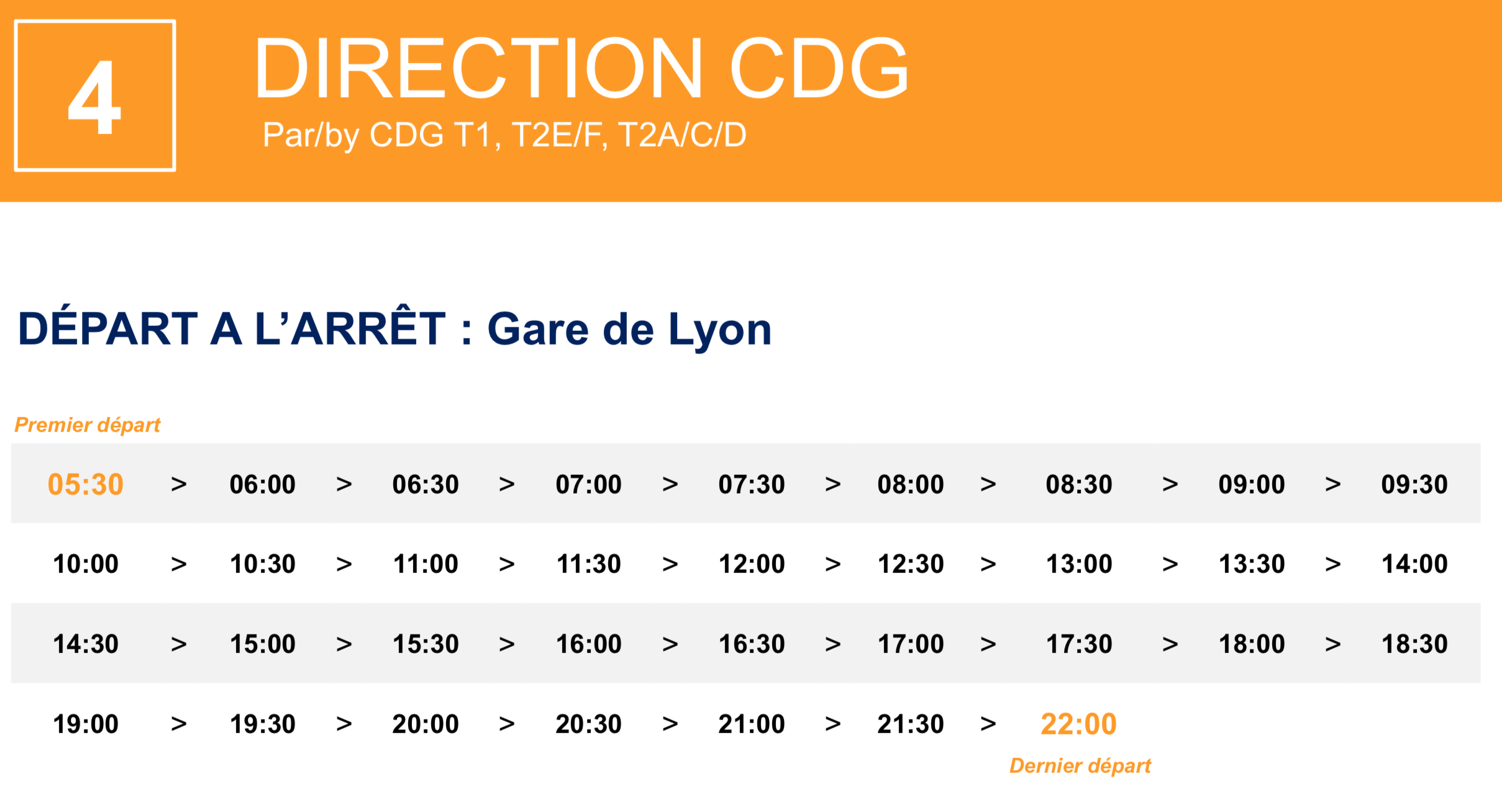 *1番線(オルリー空港⇆シャンゼリゼ)、3番線(シャルル・ド・ゴール空港⇆オルリー空港)の情報は公式サイトでご確認ください。