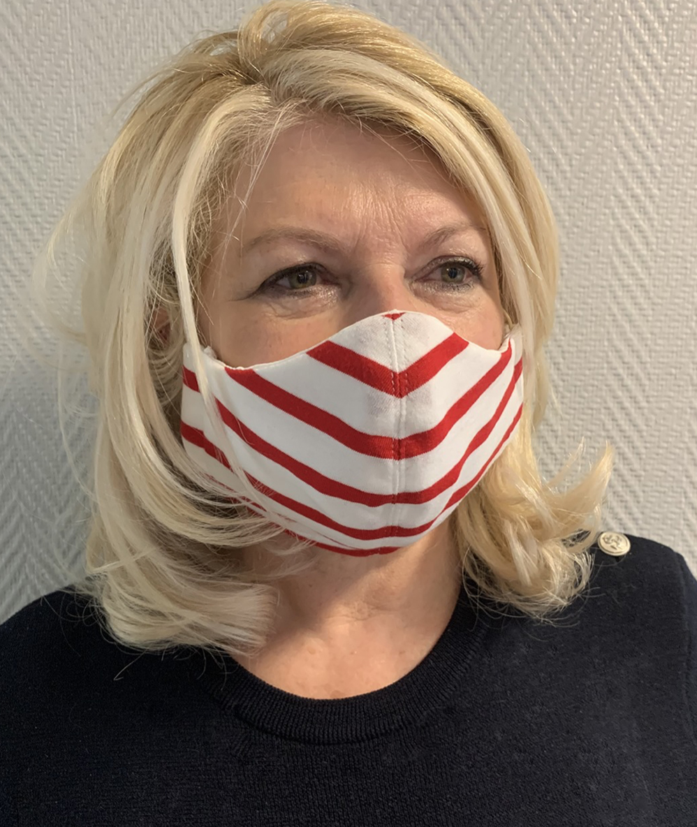 今回製造されるマスクは地元ノルマンディーの病院やクリニックを優先的に、医療従事者に寄付されます。モルトン生地をコットン生地で挟んだ3層のマスクで洗濯して何度も使用できます。写真のようなボーダー柄のマスクもきっといくつか出来上がることでしょう。