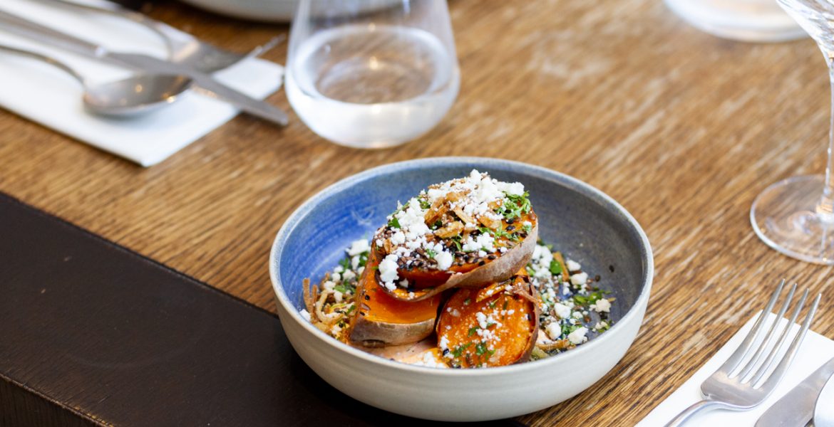 木のぬくもりと、スモーキーなグリーン、イエロー、ブルーを散りばめた落ち着きのある店内では、オープンキッチンから伝わるスタッフの活気にあふれ、見知らぬ客同士がバーカウンターや大きなテーブルで肩を並べてリラックスした時を過ごしています。