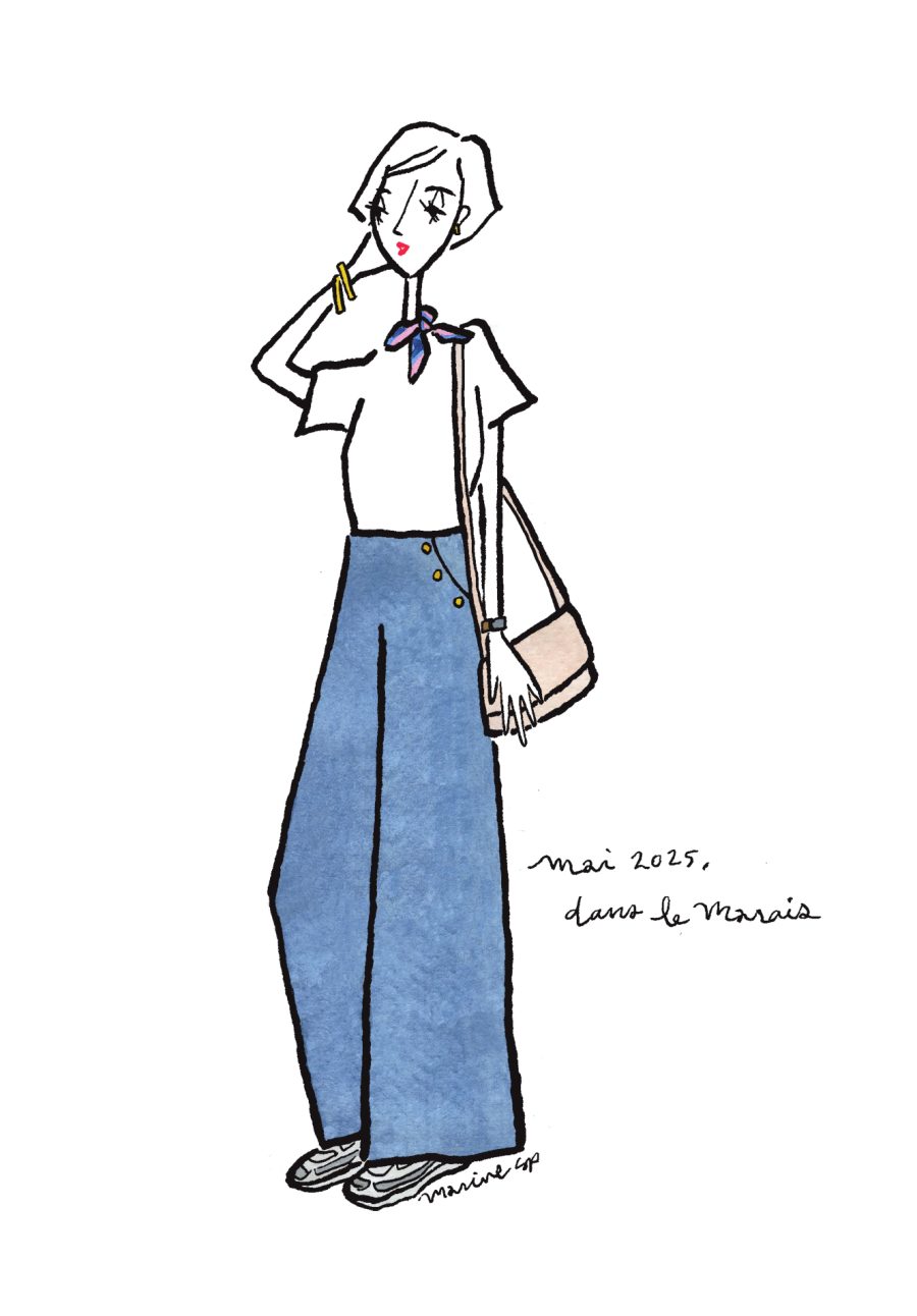 〈12ヶ月のパリジェンヌ〉mai 2025 パリ在住の日本人イラストレーターMarine(マリン)さんが毎月トリコロル・パリに届けてくれる、街角のおしゃれなパリジェンヌを描いた素敵なイラスト。パリに暮らす女の子たちがどんなコーディネートをしているのか、今のパリの空…