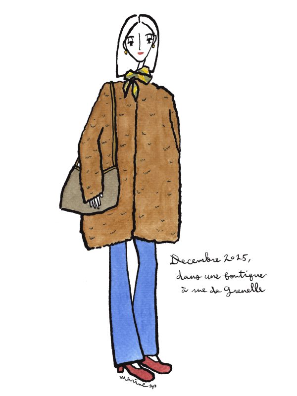 さて、パリ在住日本人イラストレーターmarineさんから届いた今年最後のイラストは、フェイクファーのコートが主役のコーディネート。羽織るだけでゴージャスな存在感のあるフェイクファーのコートは、ワードローブに1枚ほしいアイテムですが、こんなふうにストンとしたシンプルなデザインのものはずっと使えて良いですね。