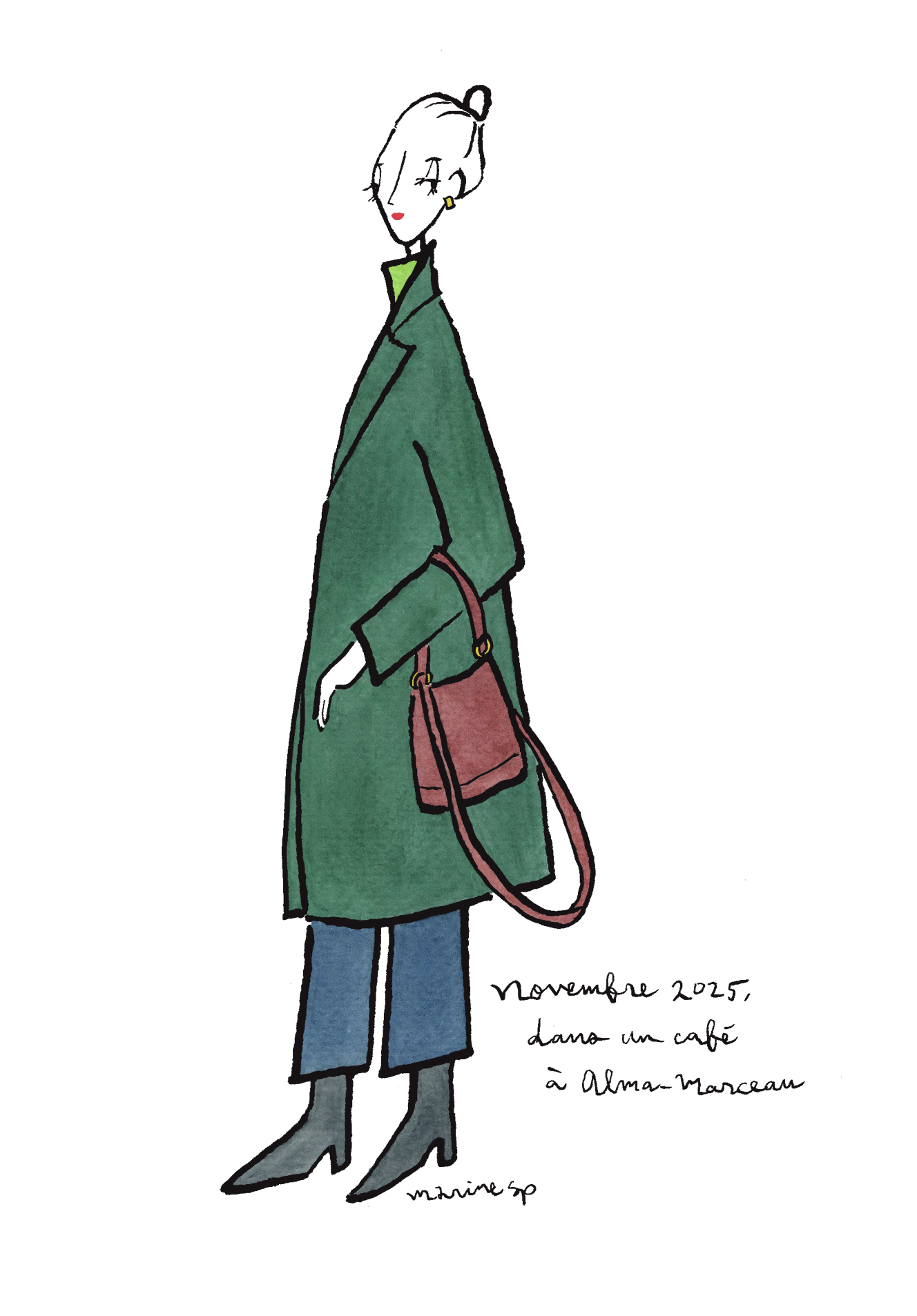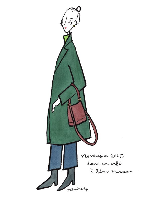さて、パリ在住日本人イラストレーターmarineさんから届いた11月のイラストは、ホリデーシーズンにぴったりの、深いグリーンが美しいコートを着こなすパリジェンヌ。形がきれいなシンプルなチェスターコートは、どんなコーディネートにも合うので重宝します。このパリジェンヌのように、同系色の明るいトーンのハイネックセーターをインしてもとっても素敵ですね。