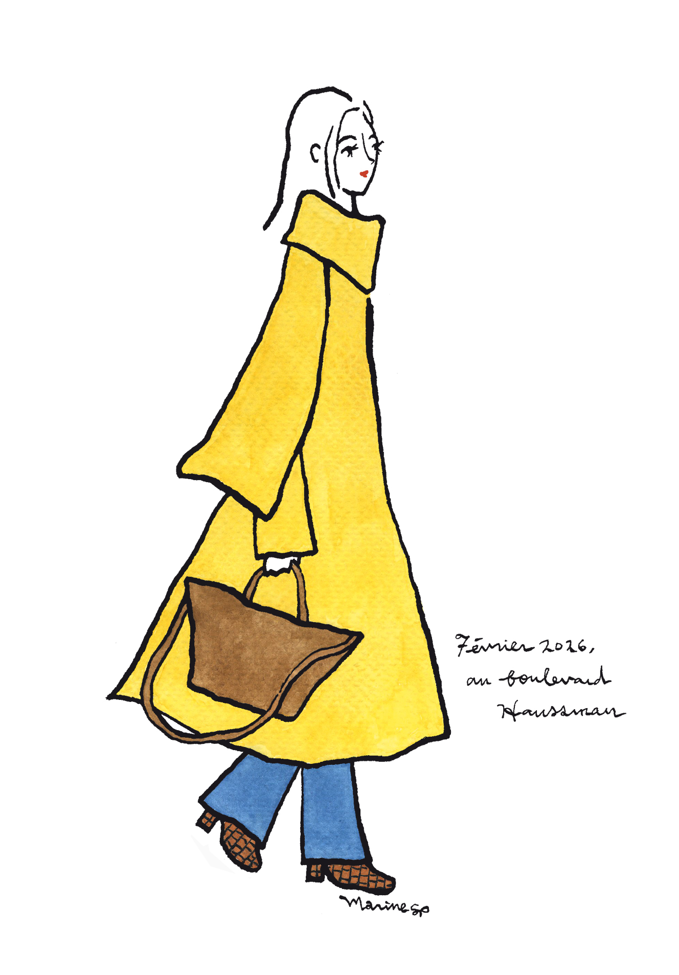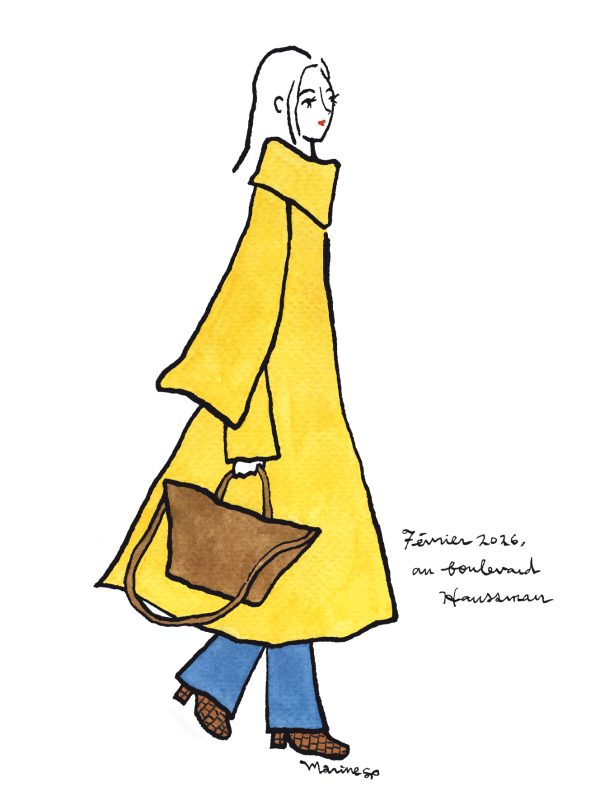 さて、パリ在住日本人イラストレーターmarineさんから届いた2月のイラストは、プランタンデパートの前で見かけたパリジェンヌ。とっても鮮やかなマスタードイエローのコートは、襟元に長い布がついているストール一体型のデザインで、この冬の一大トレンド。色々なブランドが似たようなモデルを出していますが、パッと目を惹くカラーを自分のものとして着こなしているところがかっこいいですね。