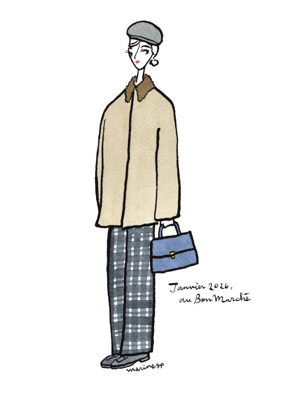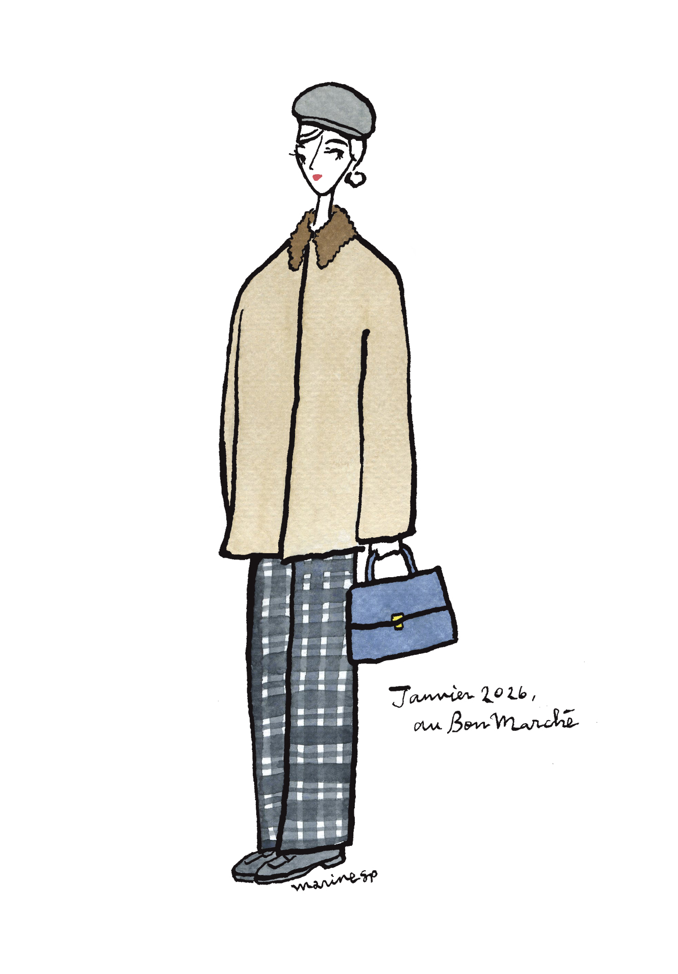 さて、パリ在住日本人イラストレーターmarineさんから届いた2026年最初のイラストは、ちょっとクラシカルなアイテム使いが目を引いたパリジェンヌ。