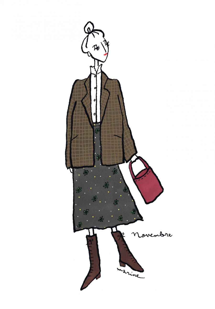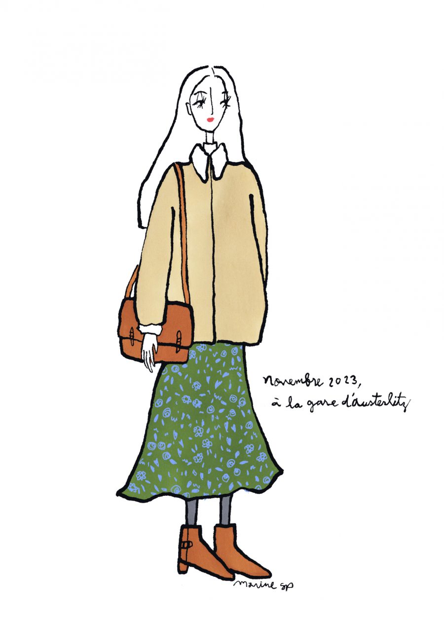 〈12ヶ月のパリジェンヌ〉novembre 2023 パリ在住の日本人イラストレーターMarine(マリン)さんが毎月トリコロル・パリに届けてくれる、街角のおしゃれなパリジェンヌを描いた素敵なイラスト。パリに暮らす女の子たちがどんなコーディネートをしているのか、今のパリの空…