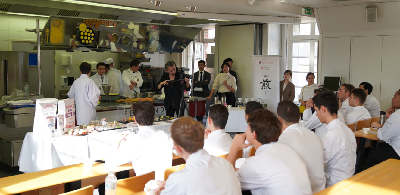 グラン・ゼコール(高等職業教育機関)に認定され、料理からサービスまで食に関するすべてを学べるフェランディ・フランス料理高等専門学校を会場に、この学校の生徒や一般の方などおよそ100名が参加しました。