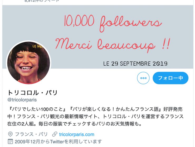 トリコロル・パリのツイッターのフォロワー数が、1万人を超えました!!2010年にサイトをオープンしてから、間もなく10年目を迎えようとしていますが、読者の皆様のおかげで今日まで休まず続けてくることができました。ツイッター…