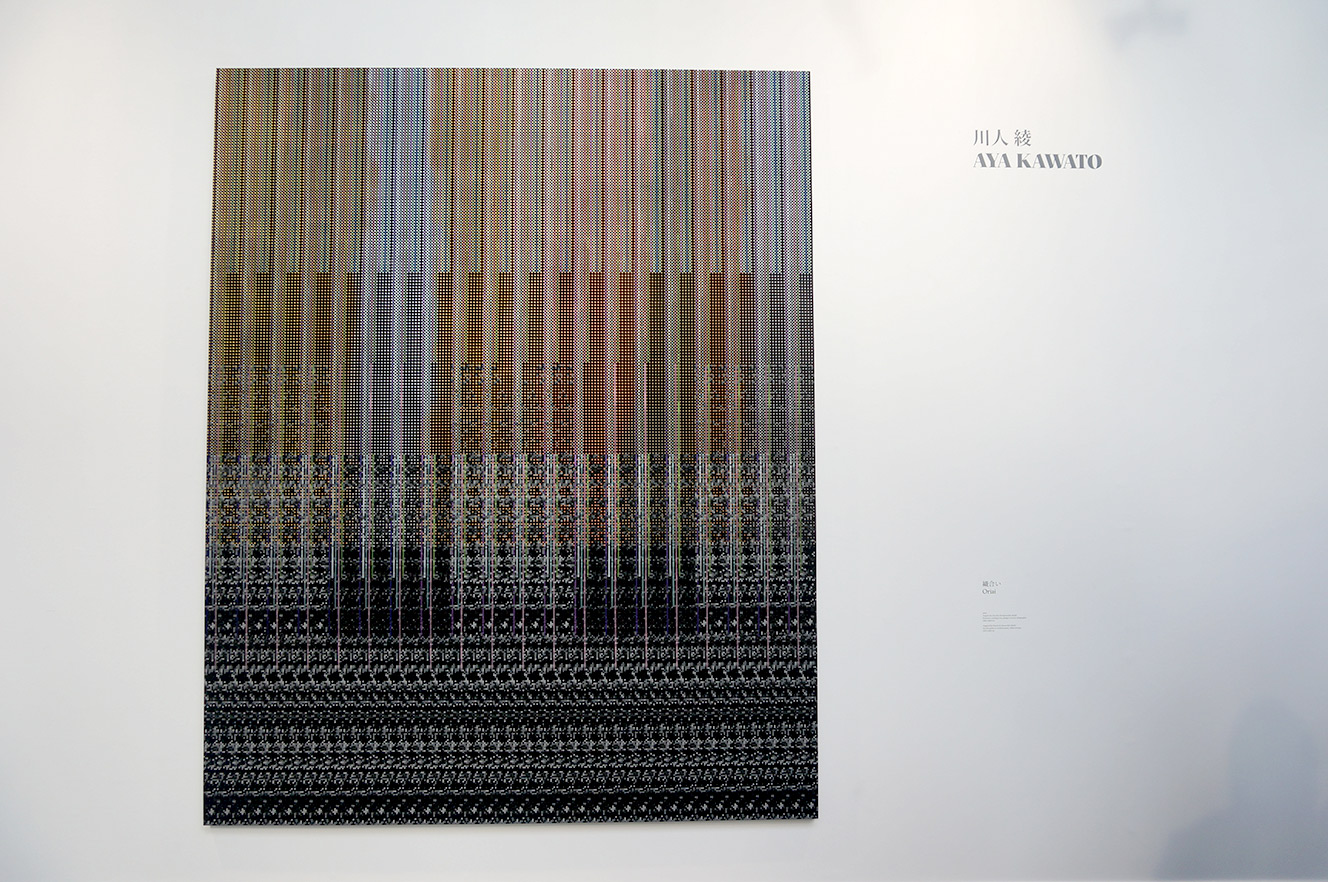 木製パネルにアクリルで手描きしたグリッドは、手作業から生まれるズレと、錯視効果(実物と目で見るものとのギャップ)が興味深い。京都で染織を学んだいっぽう、父が脳科学者だという作者らしく、伝統とテクノロジーが共存する作品。