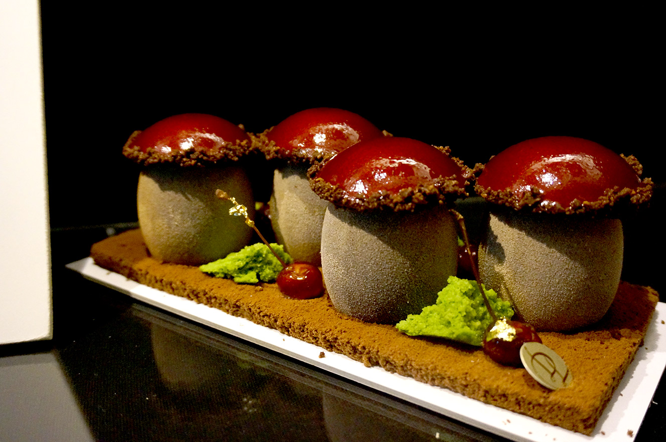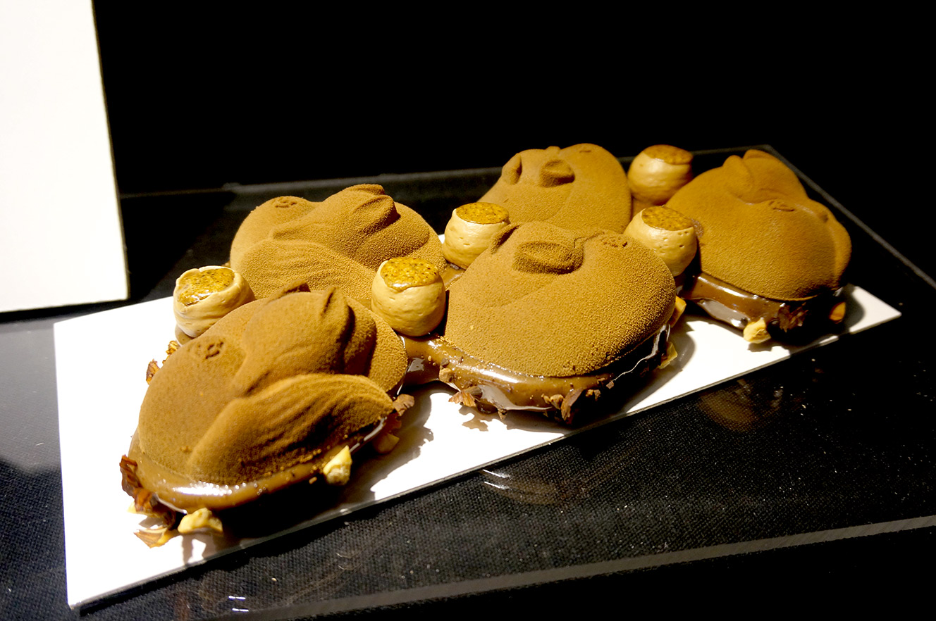 アーモンドと芥子の実のプラリネのクルスティアン/ヘーゼルナッツのビスキュイ/ローリエ風味のキャラメルムース/カカオのビスキュイ/ブナの木でスモークしたペルー産カカオ豆のチョコレートムース