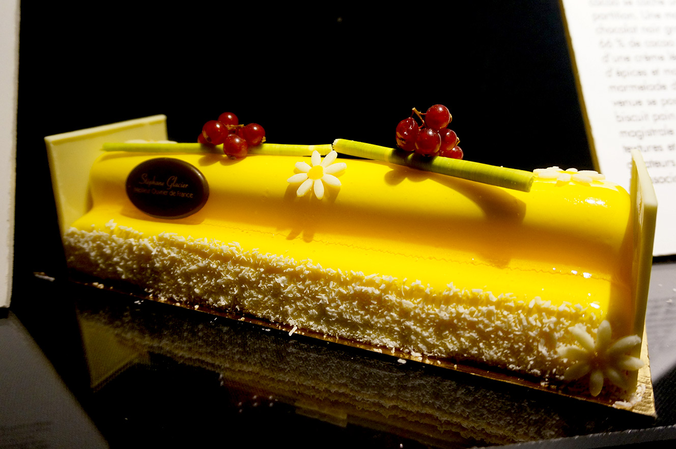 プラリネ&ココナッツのクルスティアン/ブラックチョコレートクリーム/グルテンフリーのビスキュイ/ココナッツムース/マンゴー&パッションフルーツのコンポート