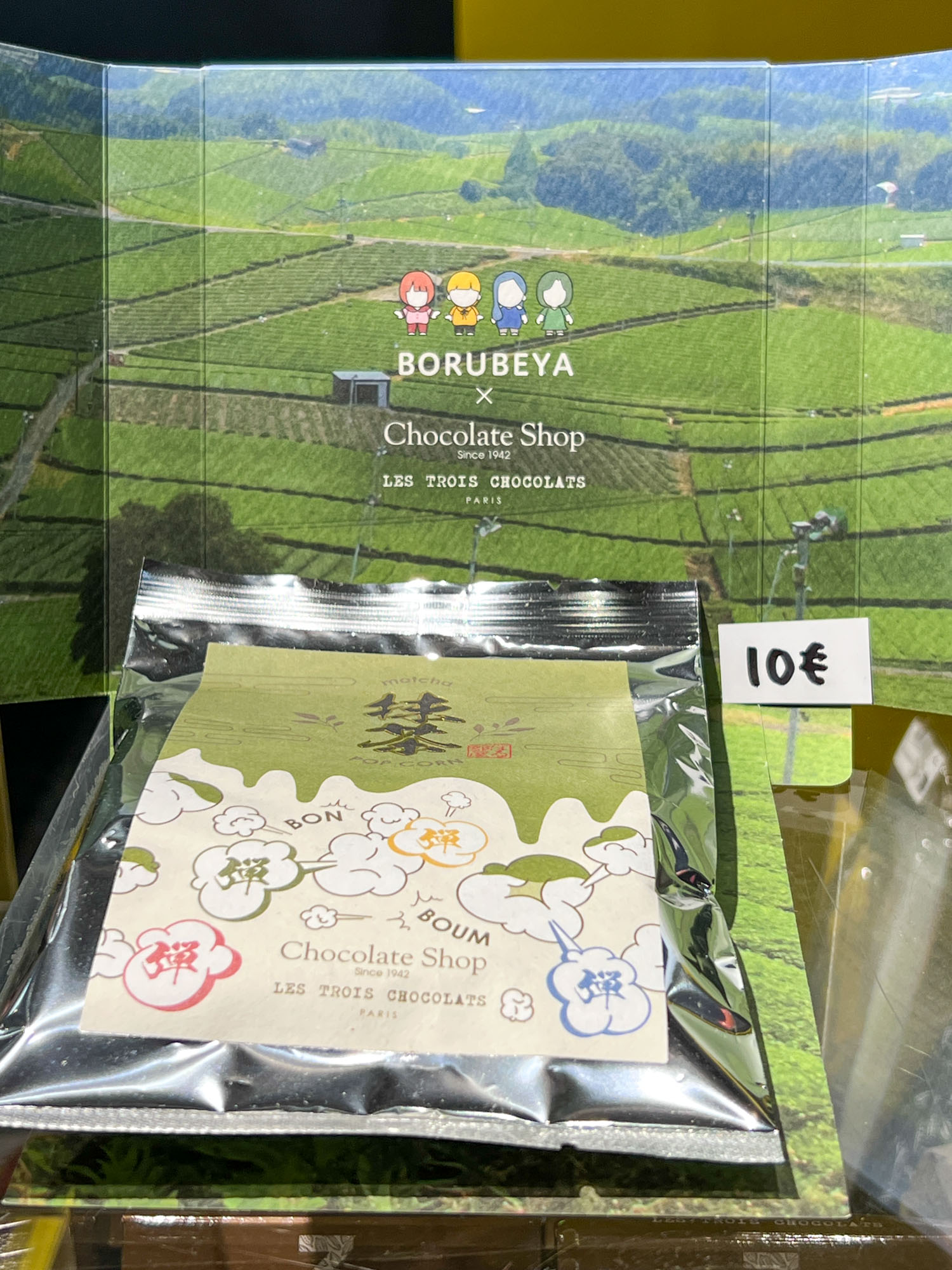 ぼる塾の番組「ぼる部屋」の企画で実現した、ぼる塾x佐野さんの実家のお店でもある福岡・博多の老舗洋菓子店、チョコレートショップxレ・トロワ・ショコラのコラボ。八女の抹茶でくるんだポップコーン、香ばしくて美味しかったです。