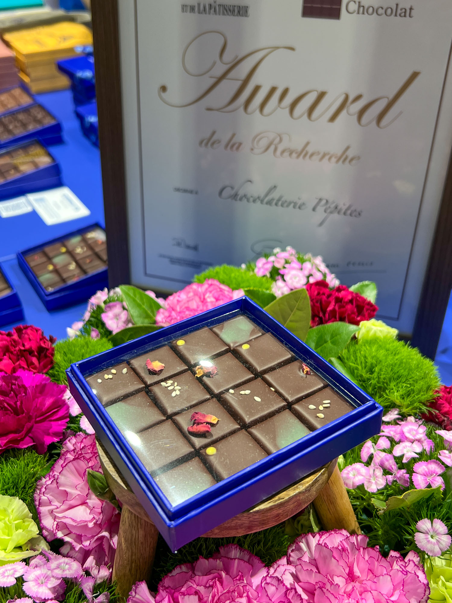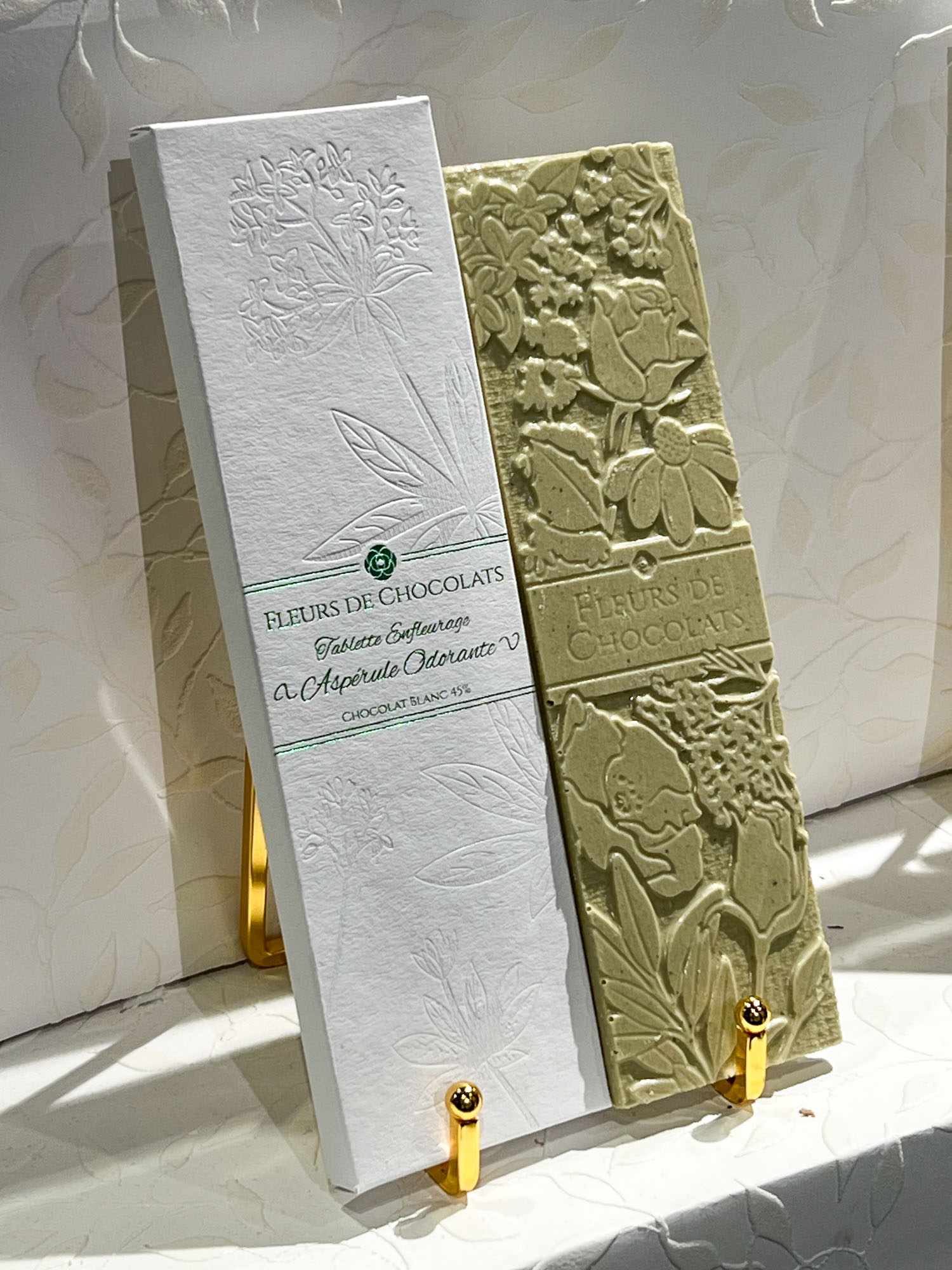 パリ16区にあるショコラティエ&お花のコンフィのお店、フルール・ドゥ・ショコラ。板チョコのデザインが素敵。